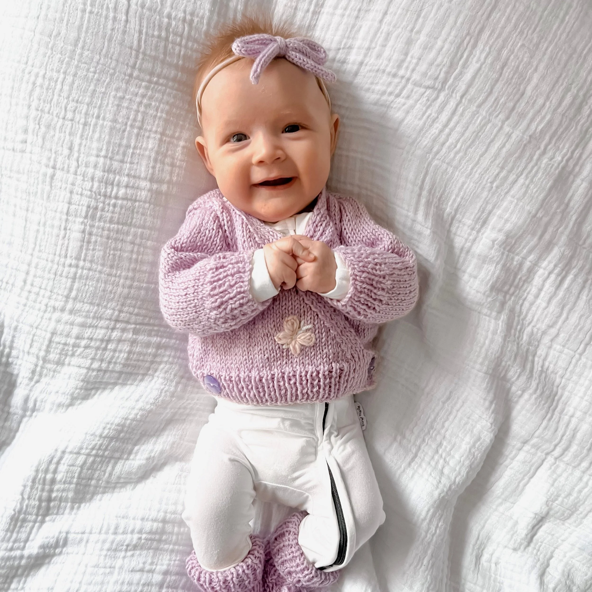 Our hand knitted wool booties are the perfect piece to keep your bubs feet cozy and warm all year round. Functional drawstring laces to ensure booties don’t fall off. Matching handknitted wool cardigans available.